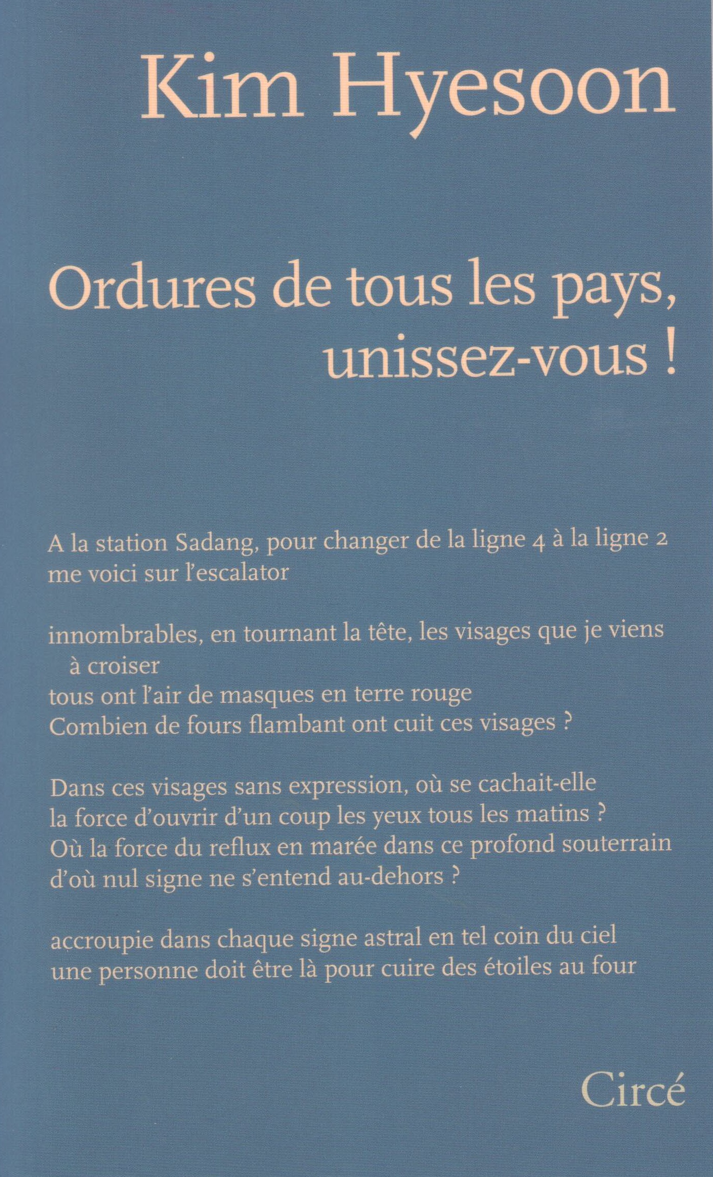 한국 여성시를 대표하는 김혜순 시인의 아홉 번째 시집 『당신의 첫』이 『전 세계의 쓰레기여, 단결하라!』는 제목으로 프랑스 시르세 출판사에서 발간되었다. 프랑스 독자들을 고려하여 시집의 구성, 제목 등을 달리하였다. 시인은 멈추지 않는 상상적 에너지로 자신을 비우고, 자기 몸으로부터 다른 몸들을 끊임없이 꺼내 독창적인 상상적 언술의 가능성을 극한으로 밀고 나간다. 한국의 시문학을 프랑스 독자들에게 알려온 프랑스 시르세 출판사에서 출간되었다.