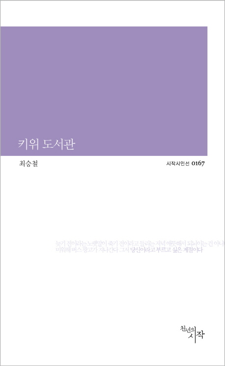 최승철의 시는 언어와 사유의 현대성, 형식구조, 어법의 발성이 대단히 유니크하다. 특히 이번 시집 『키위도서관』은 음식물 보관법 같은 생활지혜 상식, 과학상식, 잠언 등 기억과 현재의 온갖 만상을 참견을 인유해 와 산포해 놓는다. 망상까지도 철학하는 듯 회심의 현대인의 심리 초상을 보는 듯하다. 모험으로 가득한 그의 시에서는 상처의 시간을 페이소스와 유머로 환원해 내는 재치와 말의 흐름을 조절해 내는 탁월한 감각이 여기저기서 목격할 수 있다. 2002년 작가세계를 통해 등단한 작가의 두 번째 시집이다.