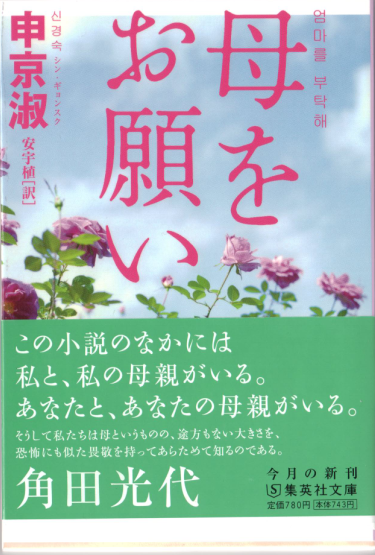 신경숙의 대표소설『엄마를 부탁해』가 일본어로 번역되어 슈에이사(集英社文庫) 출판사에서 출간되었다. 일본 최대 종합출판사 중 하나인 슈에이사 출판사는 이문열의 『사람의 아들』, 조정래의『태백산맥』등 한국 대표 문학작품을 계속해서 출간하고 있다. 번역자 안우식 씨는 한국문학 작품 170여편을 번역하여 일본에 알린 한국문학 번역가였다. 그가 지난 12월에 타계하여, 『엄마를 부탁해』는 그의 마지막 유작이 되었다. 한국문학의 대표적 해외 진출 성공 사례로 꼽히는 이 소설이 한국, 미국, 유럽 등지에서 얻은 호응에 힘입어 일본에서도 좋은 결과를 가져올 것으로 기대해 본다.